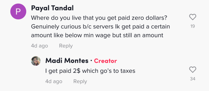 The TikToker said the couple's check was $100 and added that she doesn't make an hourly rate as a server. In a comment on her video, Montes clarified that she does make $2 per hour, but those wages ultimately go to taxes.