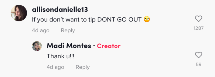 The server, Madi Montes (@madison_montes), has about 255,000 followers and frequently posts about her boyfriend and does TikTok challenges. Her video about the tip amassed about 334,000 views and 1,300 comments by Thursday.