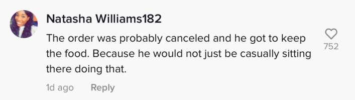 "The order was probably canceled and he got to keep the food," they wrote. "Because he would not just be casually sitting there doing that."