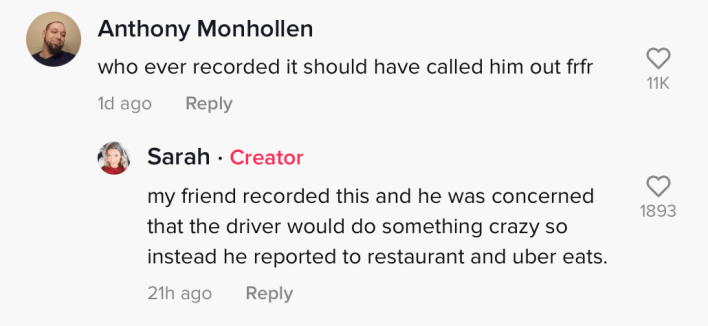 The poster commented that the delivery had been reported to the restaurant and Uber Eats by her friend who recorded the whole thing. The man who filmed didn't confront the courier because he was concerned the driver would lash out.