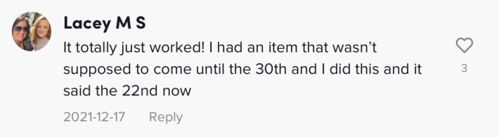 "It totally just worked!" one commenter wrote. "I had an item that wasn't supposed to come until the 30th and I did this and it said the 22nd now."