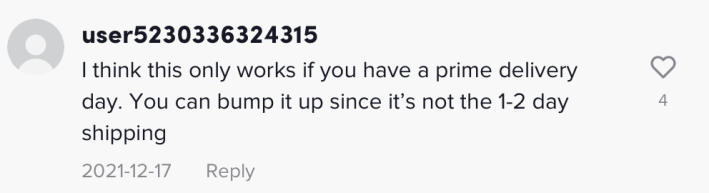 "I think this only works if you have a prime delivery day," one commenter speculated. "You can bump it up since it's not the 1-2 say shipping."