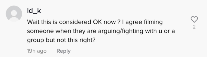 Another commenter questioned what seems like a new norm: filming people without consent who aren't talking to you, and putting them on blast. "Wait this is considered OK now?" they wrote. "I agree filming someone when they are arguing/fighting with u or a group but not this right?"