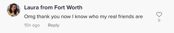 "Omg thank you now I know who my real friends are," reads a comment from an account that appears to have been created just for this video, given that it has no followers, follows no one, and is called "Laura from Fort Worth."
