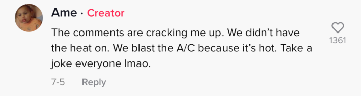 "The comments are cracking me up," the poster wrote. "We didn't have the heat on. We blast the A/C because it's hot. Take a joke everyone lmao."