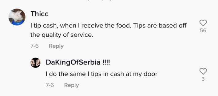 Other, more freaked-out DoorDash customers remarked on how they wait to tip in-person, instead of through the app, making it look like they initially don't tip the DoorDasher. The poster acknowledged one such comment, saying cash tips in the area are rare, which is why they didn't expect the customer to tip at all.