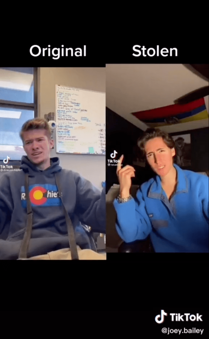 Joey Bailey, known as @joey.bailey on the app, posted a video on March 15 showing side-by-side comparisons of Trujillo’s videos and other creators’ content. The former were featured under the label “stolen” and the latter were labeled “original.” The seven TikTokers whose “original” videos were allegedly “stolen” include @nuhchez, @ty_t.v, @brodiefalgoust, @dawson.taylor1, @licout, @lemmuelmamotsau, and @joey.bailey. Trujillo’s videos are nearly identical to theirs. The Daily Dot confirmed that all of the videos under the “original” section were posted before Trujillo’s similar videos.