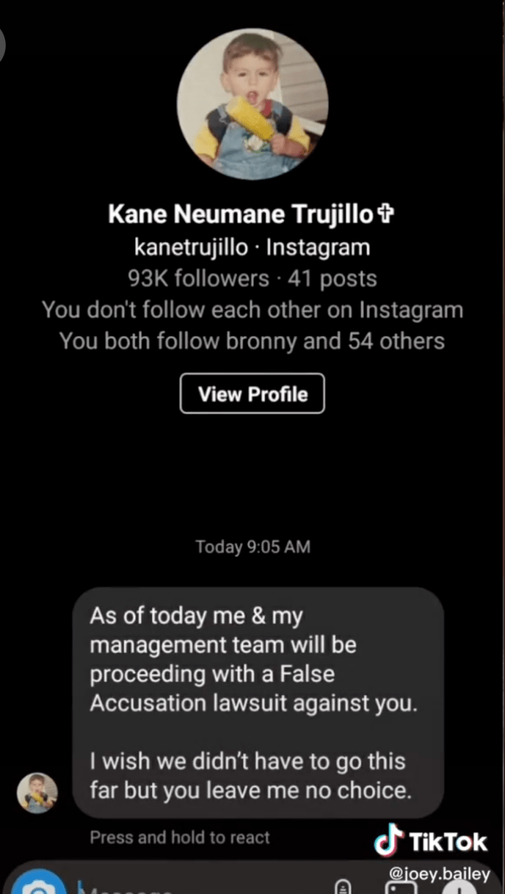 Bailey unprivated the video, and he says that soon after, Trujillo sent him another Instagram message threatening legal action. He showed a screenshot of the alleged message in the video.