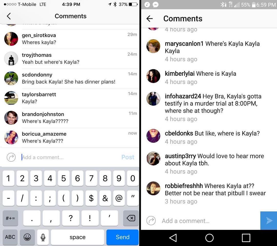 This was originally organic, but then Kayla posted "His IG is Eperrrrota everyone post 'Where's Kayla'" as her status.