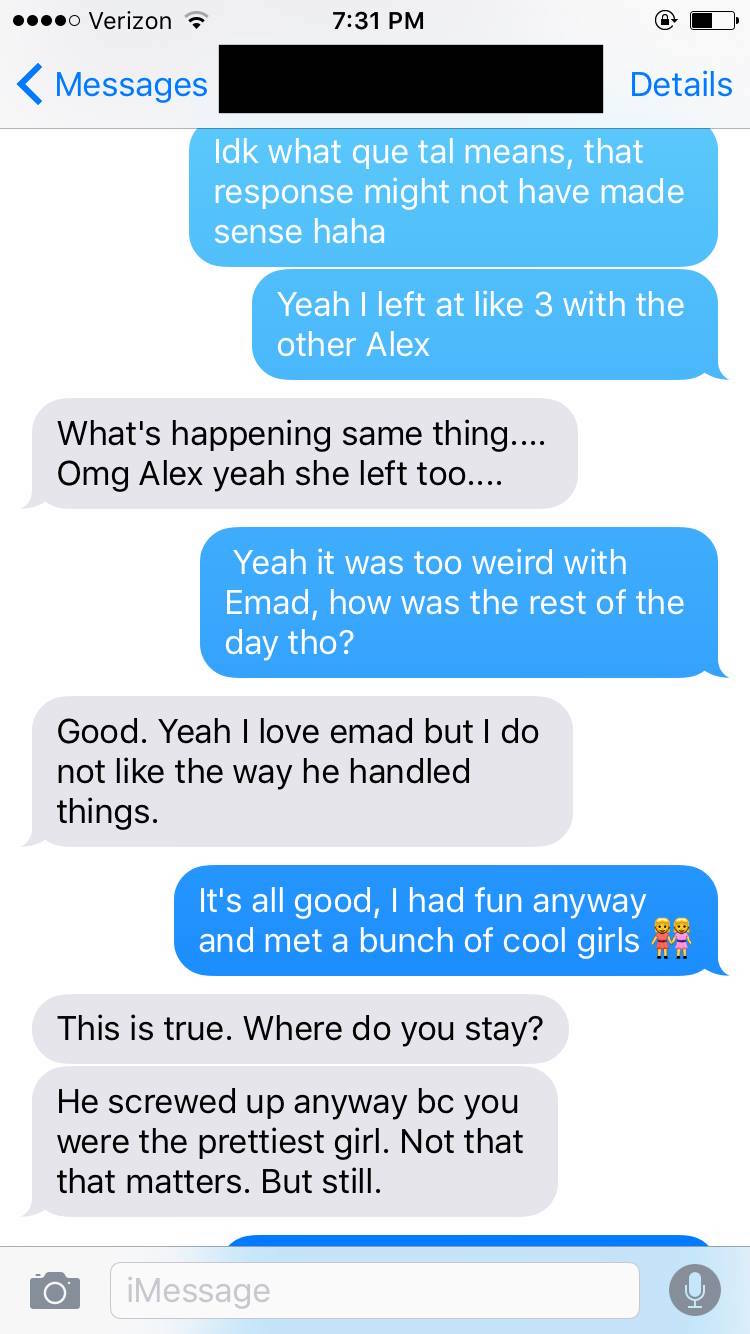 Meanwhile, Emad was busy making out with "a very pretty Brazilian girl."