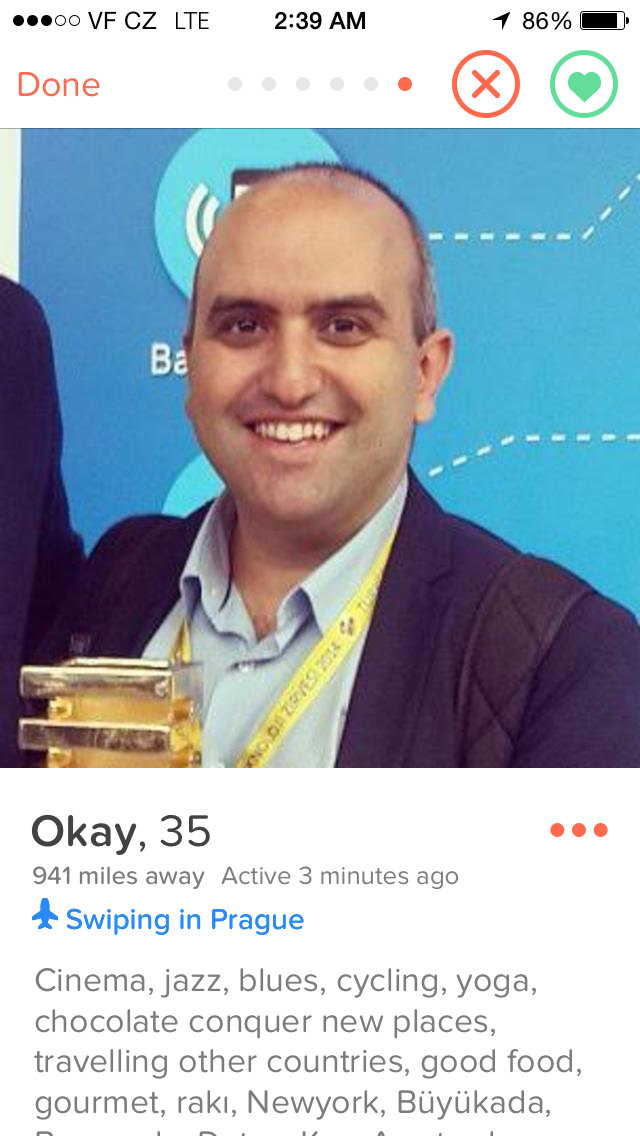 Back home in New Orleans, the Tinder de rigueur was men on boats holding up fish, hunters with ducks strapped around their camo jackets like dead animal chandeliers, and lots of stupid Mardi Gras photos. Prague Tinder is different. Prague Tinder is forced style and lack of substance: hundreds of sepia- to grayscale-tinged photos taken in luxury vehicles with enough brands loaded into an outfit to warrant a sponsorship. Occasionally, though, the truly out of place will appear, their dating prowess so overly advanced they deserve their own platform altogether.