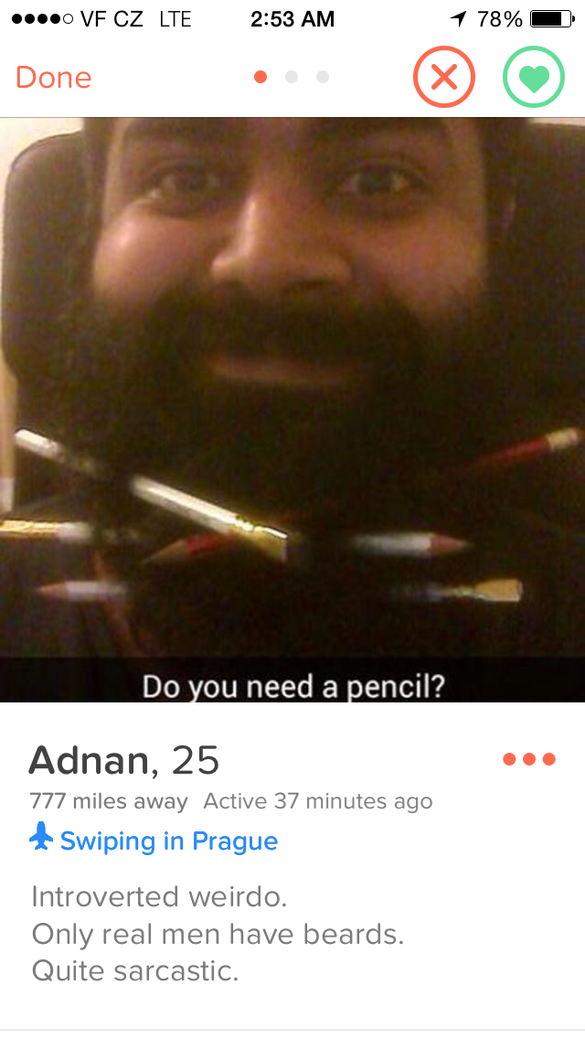 I feel like there’s some type of burgeoning romance about to happen between the chewed out and entangled beard pencils of Adnan and the pencil sharpener/veggie implement of Chocolateman. Perhaps this is what Prague Tinder is actually all about—connecting the weirdos with the even bigger weirdos by way of a wary American whose only dating success abroad so far has been her ability to use the unmatch and report functions.