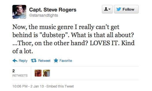 This Captain America account is one for the old-school fans, a Twitter version of the slice-of-life roleplayer blogs that originally became popular in LiveJournal fandom. @starsandtights tweets entirely in character, interacting with followers and participating in an ongoing Avengers soap opera of Twitter roleplayers including Tony Stark and Bucky Barnes. @starsandtights is similar to the type of Captain America one sees in fanfiction: sweet, patriotic, and slightly confused by 21st-century technology.