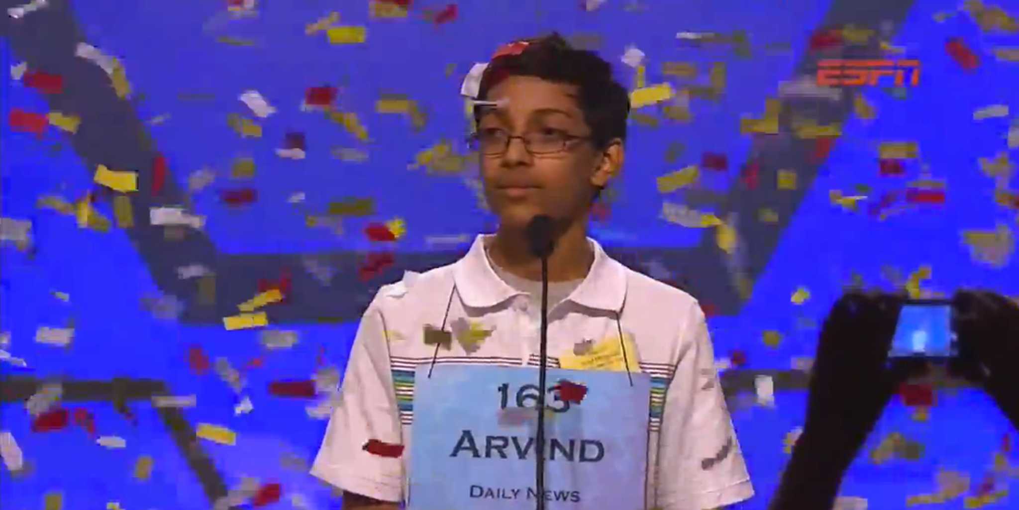 Mahankali had finished third in each of the past two spelling bees, but this time he was victorious. After clinching the title by spelling the word "knaidel," the confetti dropped down on him where he stood still and took the moment in.