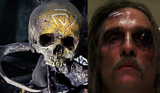 In the inner chamber of Carcossa, there's a yellow skeleton king which appears to be sitting on a throne. A closer look reveals the skeleton has the cult's symbol, the omnipresent spiral, carved on its forehead. Here's a side-by-side of the skeleton with the cross that seems to be emblazoned on Rust's forehead:
