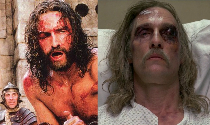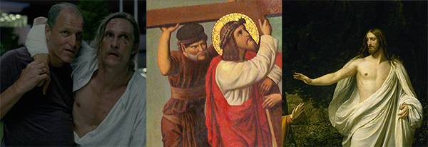 No, really. Earlier in the series, he tells Marty he's been thinking about Jesus in the Garden of Gethsemane, and Christ's decision to allow his own crucifixion. If the look on his face as he enters Carcossa doesn't tell you everything you need to know about Rust's mental state, his conviction that he wasn't supposed to come back from the experience fills in the rest. But if you need visuals, here are all the ways in which the finale stages him in numerous visual references to Christ.