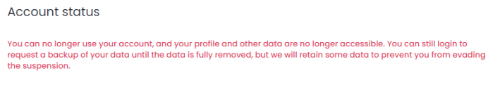 Attempts to sign in returned an error notice that said, "You can no longer use your account, and your profile and other data are no longer accessible. You can still login to request a backup of your data until the data is fully removed, but we will retain some data to prevent you evading the suspension."
