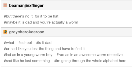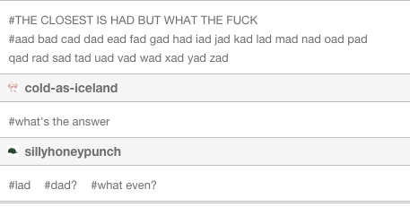 The top vote-getters seemed to be "dad," "had," and "rad," with a few "hat"s thrown in, because Tumblr is nothing if not full of out-of-the-box thinkers.