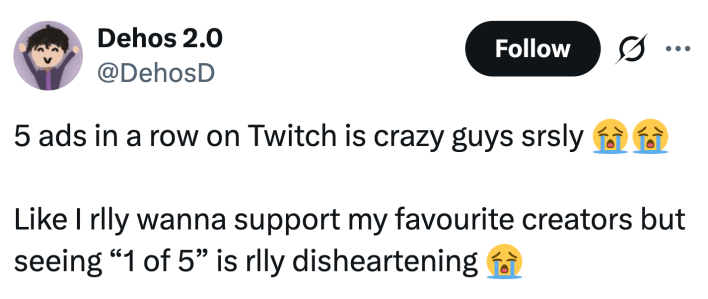 And a fourth complained: "5 ads in a row on Twitch is crazy guys srsly. Like I rlly wanna support my favourite creators but seeing “1 of 5” is rlly disheartening."