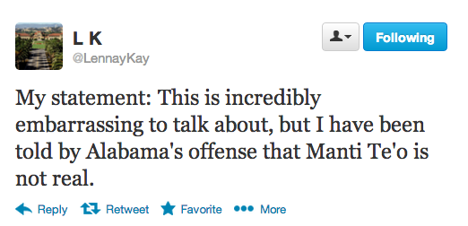 To be fair, there's little reason to think whoever's controlling @LennayKay right now is the same person as "Lennay Kekua," or whoever was behind the account when Te'o would tweet out such sweet nothings as the one he posted the evening of Nov. 6: