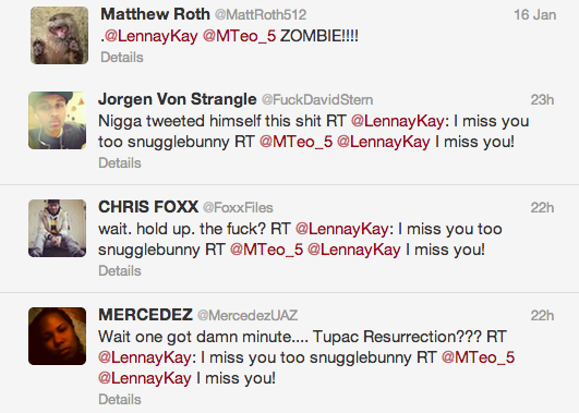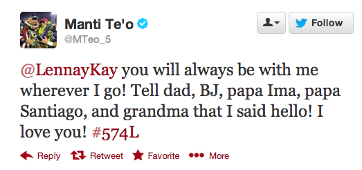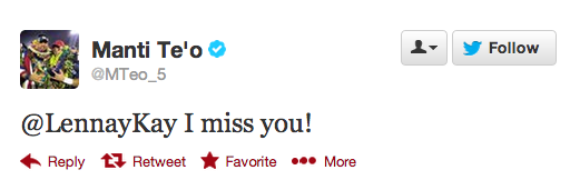 At first, on Wednesday evening, @LennayKay simply retweeted two of Te'o's sweeter tweets: The "miss you" one above, and one where he gave a shout-out to Kekua's entire made-up family: