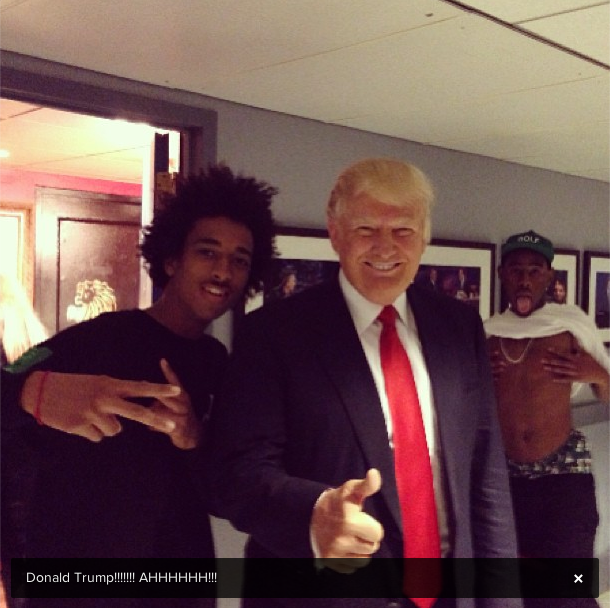 On location at NBC's 30 Rockefeller Plaza for a taping of Late Night With Jimmy Fallon yesterday, the villainous real estate mogul and notable Twitter grinch posed for a photograph with the Odd Future rapper, his enthusiastic thumbs-up indicating that he had no idea the merry prankster Tyler was rubbing himself suggestively right behind them.