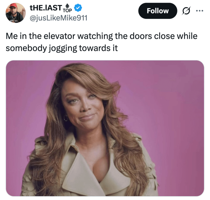 @jusLikeMike911 joked, "Me in the elevator watching the doors close while somebody jogging towards it."