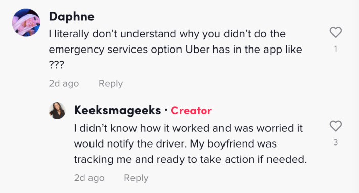 Commenters questioned @keekssmageekss, asking why she didn't just use any kind of safety or emergency features of the Uber app. She replied that she wasn't sure how it worked, and she didn't want to alert the driver to how she was feeling, unsure if he would react violently.