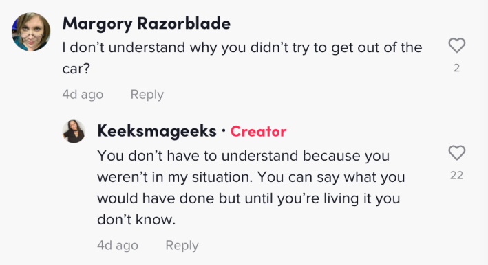 When another commenter wrote that they didn't understand why she didn't just try to get out of the vehicle, @keekssmageekss told them they "don't have to."