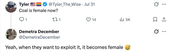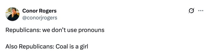 So to see a government account under a Republican administration start labeling coal a "she" was just downright goofy. It doesn't matter that humans have been anthropomorphizing things like cars and boats for as long as they've been around. MAGA wanted a war on pronouns; the least they can do is stick to their guns (he/they).
