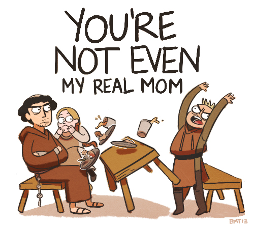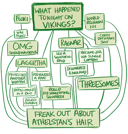 If you’re assuming that the above cartoon is an exaggeration of what happens on the show, think again. One of the main storylines of season one is Ragnar raiding a monastery and bringing back Athelstan, a British monk, to be the house servant to his family. (Lagertha, Ragnar’s wife, is far more interested in swordfights and helping to rule the town than in sitting around indoors all day.)