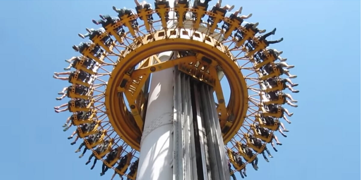 Shared on Thursday by a Twitter user known as Vince, the clip shows a group of ride-goers being shot hundreds of feet into the air before being spun around on retractable swings.