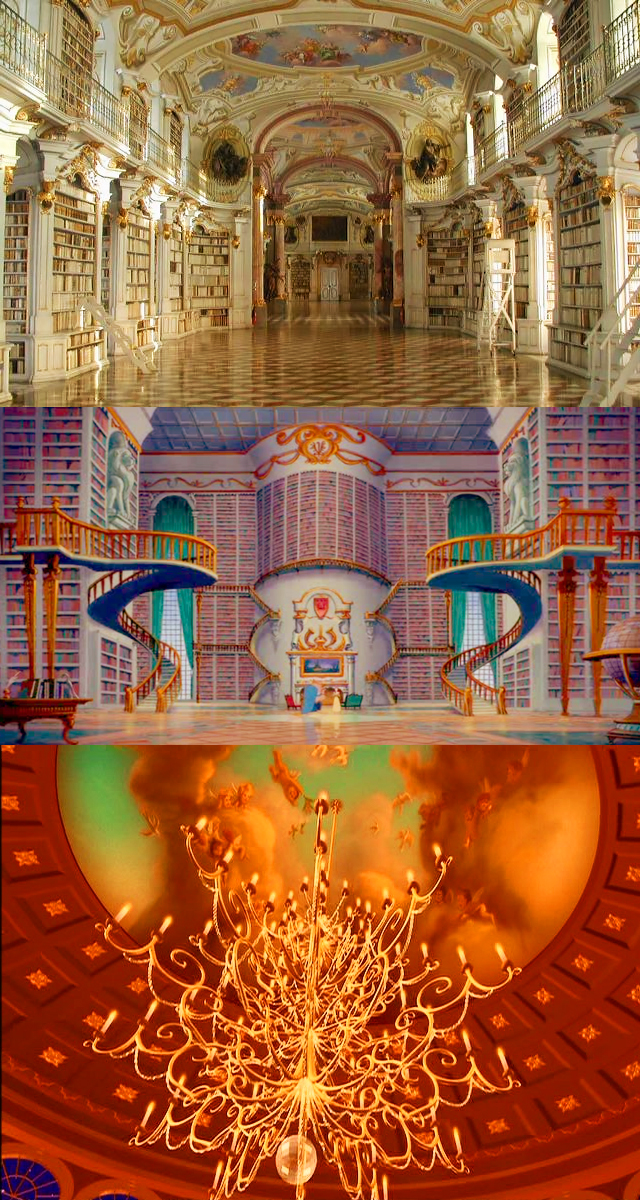 Like Admont Abbey, the design of the Beast's castle features ornate Baroque architecture and design. The library and the ballroom in particular utilize many elements of the period, including heavy furnishings, a clean, opulent style blended with intricate detail, and ceiling frescos. Here's a visual comparison of the library at the Abbey with the library from Beauty and the Beast and the ceiling of the castle's fabled ballroom: