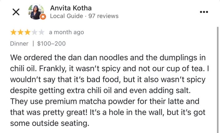 "We ordered the dan dan noodles and the dumplings in chili oil," she wrote, according to a screenshot making the rounds on social media. "Frankly, it wasn't spicy and not our cup of tea. I wouldn't say that it's bad food, but it also wasn't spicy despite getting extra chili oil and even adding salt."