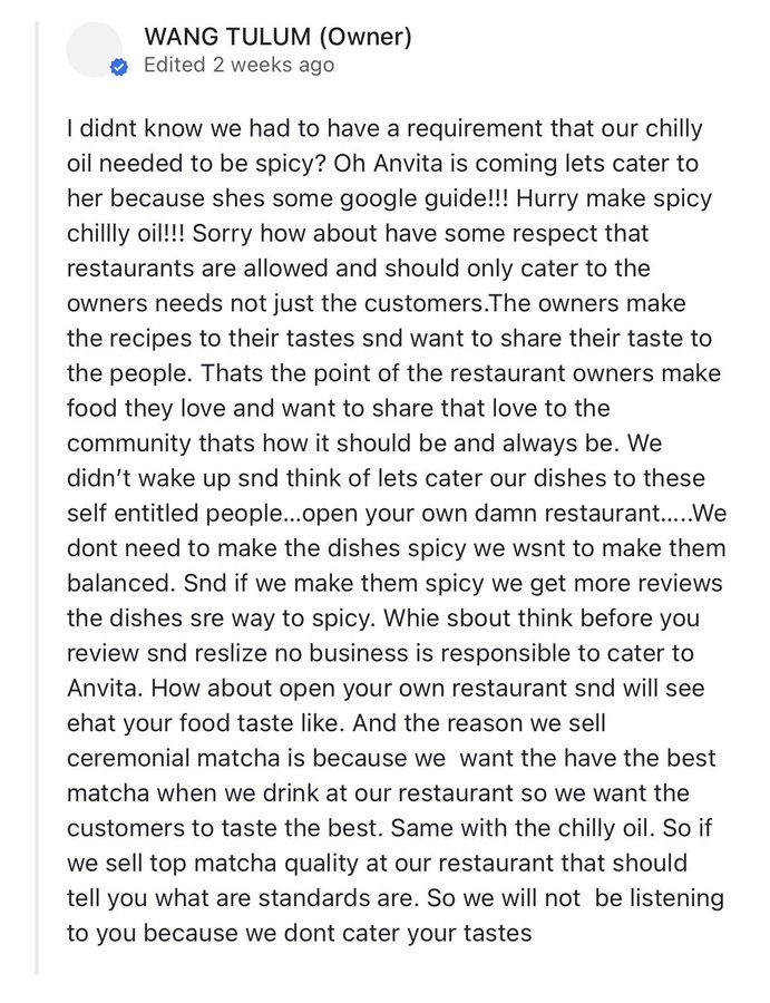 In a response that dwarfs the initial review, the owner immediately got snarky, writing, "I didnt know we had to have a requirement that our chilly oil needed to be spciy? Oh Anvita is coming lets cater to her because shes some google guide!!!"