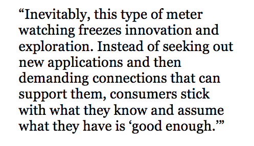 Inevitably, this type of meter watching freezes innovation and exploration. Instead of seeking out new applications and then demanding connections that can support them, consumers stick with what they know and assume what they have is “good enough.” After all, adding something new to their internet diet is just going to bring them closer to their cap.