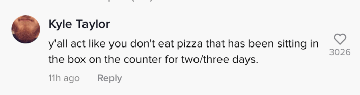 "Y'all act like you don't eat pizza that has been sitting in the box on the counter for two/three days," they wrote.