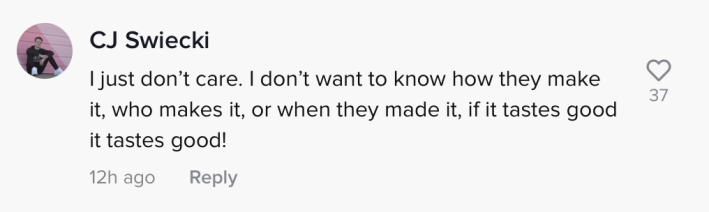 "I just don't care," @its_cj_fyi wrote. "I don't want to know how they make it, who makes it, or when they made it, if it tastes good it tastes good!"