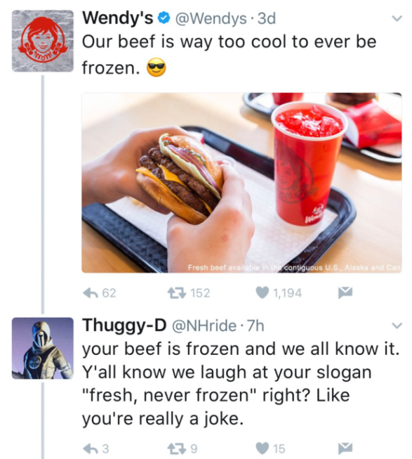 Our online story begins with Wendy's sending out an innocuous tweet about its hamburger patty motto, "Always fresh, never frozen."