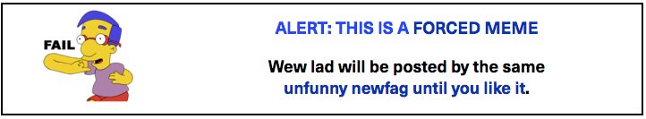 Practically every account of Wew Lad, from Reddit to Urban Dictionary to Encyclopedia Dramatica, describes it as a "forced" meme—one that doesn't have any comedy value, but was inflicted on 4chan through aggressive repetition from its few fans. The proponents of wew lad are frequently described as "newfags," 4chan slang for anyone who has spent less time on the site than you.
