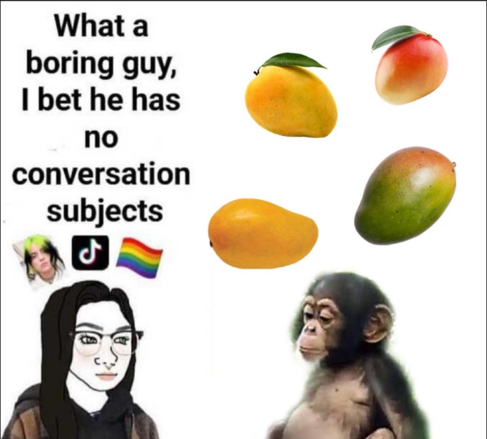 Also above her are the words that gave the meme its name: "What a boring guy, I bet he has no conversation subjects."