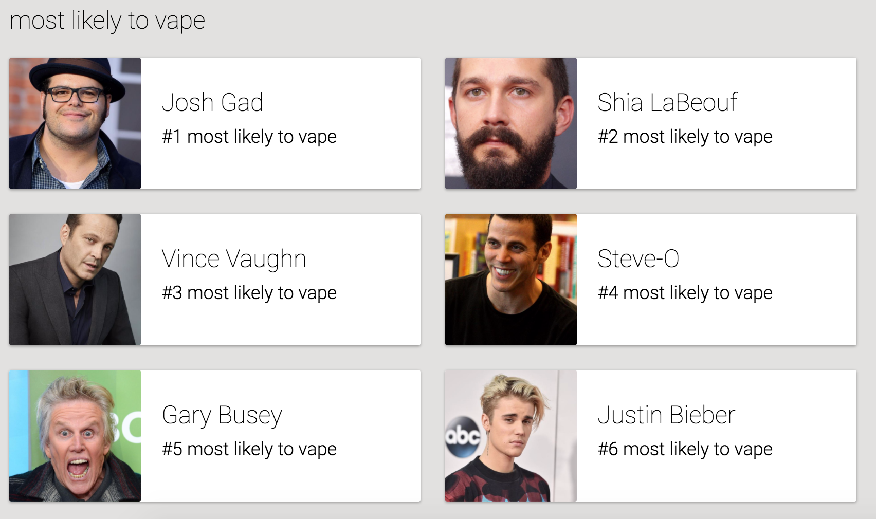 This isn't a knock against the site's concept but rather a weird display of unconscious bias, though Josh Gad does look pretty damn vapetastic in that smarmy fedora headshot. Gary Busey just looks like he confused a vape cloud with a ghost.