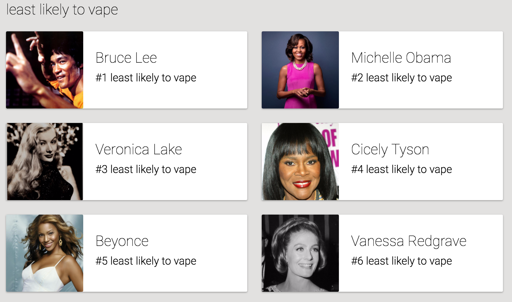 Then there's the "least likely to vape" list. It's worth noting that the site and its owner take a very anti-dead celebrity approach to voting. Wood says he's working on tools to better report shitty photos, as well as the appearance of the departed. Until those fixes get made, the top of the vape-free list remains very much not alive. It's topped by Bruce Lee, and he's surrounded by women, one of whom is also dead.