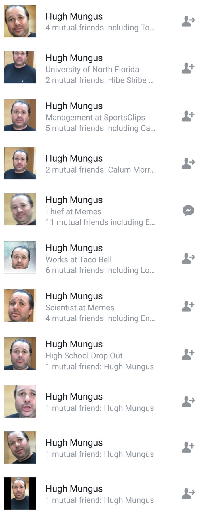 Which brings us to the strange phenomenon of all the Hugh Munguses on Facebook. There are so many that we had to crop these search results, which contained dozens more accounts.