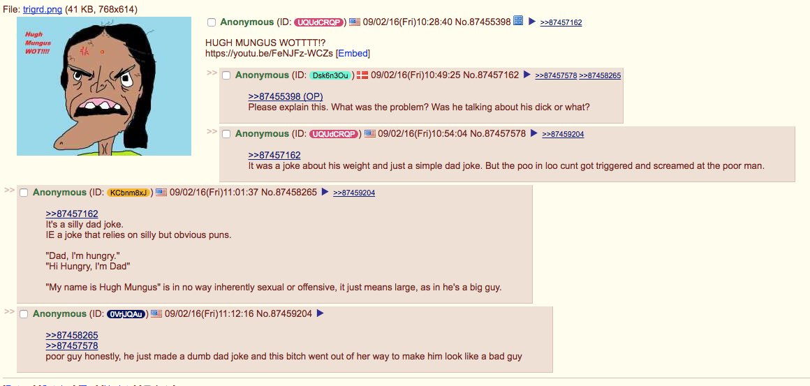 Klein describes "Hugh Mungus" as nothing more than casual dad humor—"Hugh Mungus, humongous, that's the joke"—and says the incident "perfectly encapsulates how crazy this social justice warrior shit has gotten, how sensitive these people are."