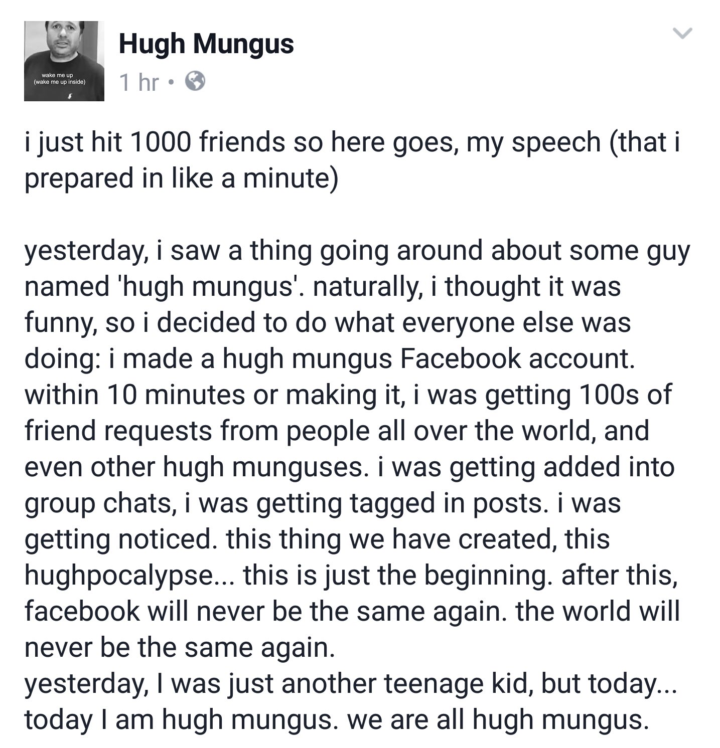 Hugh's time as a meme may have passed, though. It seems Facebook has begun suspending the accounts for using an obviously false name. In the parlance of the meme pages, they're getting "zucced."