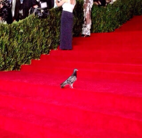 I didn't, however, actually want to know who this bird was, and I was more than certain that it wasn't some celebrity's pet who tagged along to the 2014 Met Gala. The statement "who is she" was more of a joke about the spotlight that the pigeon had unknowingly stepped into at this glamorous event. It stood there as a subversion of what we'd normally expect to see at a red-carpet gala full of gorgeous people in luxurious outfits.