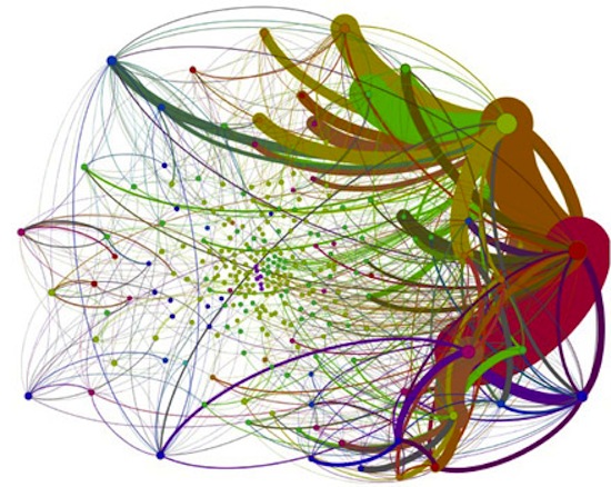 This one shows the divergence of opinion over time on the Wikipedia anarchism article. Dots are editors, and lines connect editors who disagree. The larger the dot, the more active the editor. Likewise, the thicker the line, the more intense the dispute.