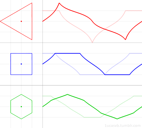 In this graph, Lucas is illustrating the familiar sine wave as derived from a circle, and the less familiar look of the same wave when derived from a square and a polygon. The result is an elegant illustration of the practical applications of mathematics. In a follow-up post, he renders these same trigonomic functions as sound waves, with the option to alter both frequency and function: