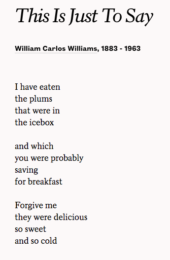 Yet there's something over and beyond the formal qualities of "This Is Just To Say" that make it so funny to play with. Perhaps it's that Williams hasn't actually apologized for eating the plums—he only asks for forgiveness. Could he have been some 80 years ahead of the #SorryNotSorry trend?